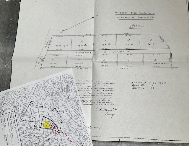 In 1908, E.C. Reynolds was the surveyor for land owned by the Perrys, registered as West Friendship. Reynolds’ house is lot 4 in the photo below and marked in yellow on the survey completed withe the creation of the Willard Avenue Neighborhood Park in the 1970s.